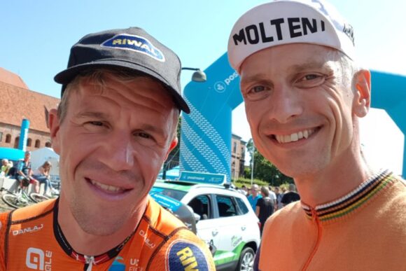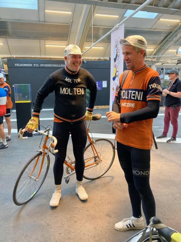 Efter paradekørslen sagde jeg til Chris, at han kunne beholde Moltenitrøje og kasket – men så skulle han også få bygget sig en orange stålcykel. “Den er jeg med på”, grinede han.