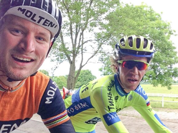 Stemmen var selvfølgelig Chris Anker Sørensens, der på det tidspunkt kørte for Tinkoff. Chris Anker havde på sin træningstur spottet en orangeklædt retrorytter, og i stedet for blot at drøne forbi, så valgte Chris Anker, at følges lidt med Kasper. For Chris Anker var oprigtig interesseret. Ikke kun i cykelsporten, som havde været en del af han liv siden han som 13-årig droppede fodbolden. Chris Anker var også interesseret i cykelsportes historie.